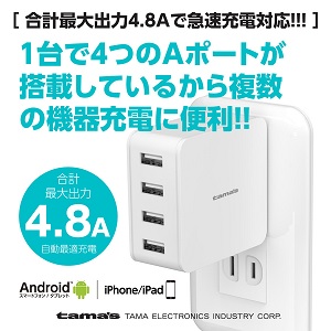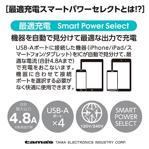 USB-Aポートに接続した機器をICが自動で見分けて 最適な電流(合計4.8Aまで)で充電!